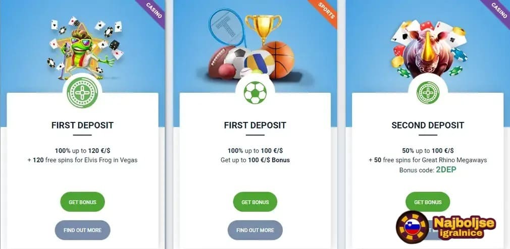 - Bonus za drugi depozit: do 100 € + 50 brezplačnih vrtljajev