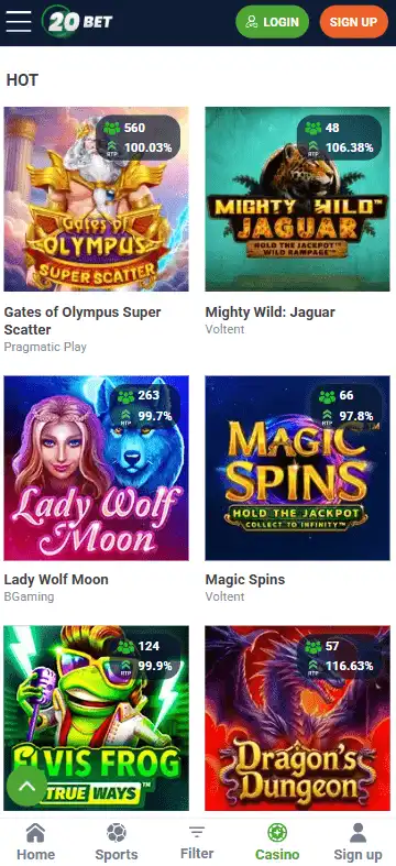 Moč knjižnice iger 20Bet Casino temelji na sodelovanju z več kot 40 vrhunskimi razvijalci programske opreme. Industrijski velikani, kot so NetEnt, Pragmatic Play, Evolution Gaming, Yggdrasil in Spinomenal, prispevajo k ponudbi platforme in ponujajo mešanico klasičnih in najsodobnejših naslovov. Igralci lahko igre filtrirajo po razvijalcih in celo preizkusijo demo različice brez pologa. Z rednim dodajanjem novih naslovov stran ostaja aktualna in razburljiva, zato lahko ob vsaki prijavi v igralnico 20Bet Casino zlahka najdete nekaj svežega.