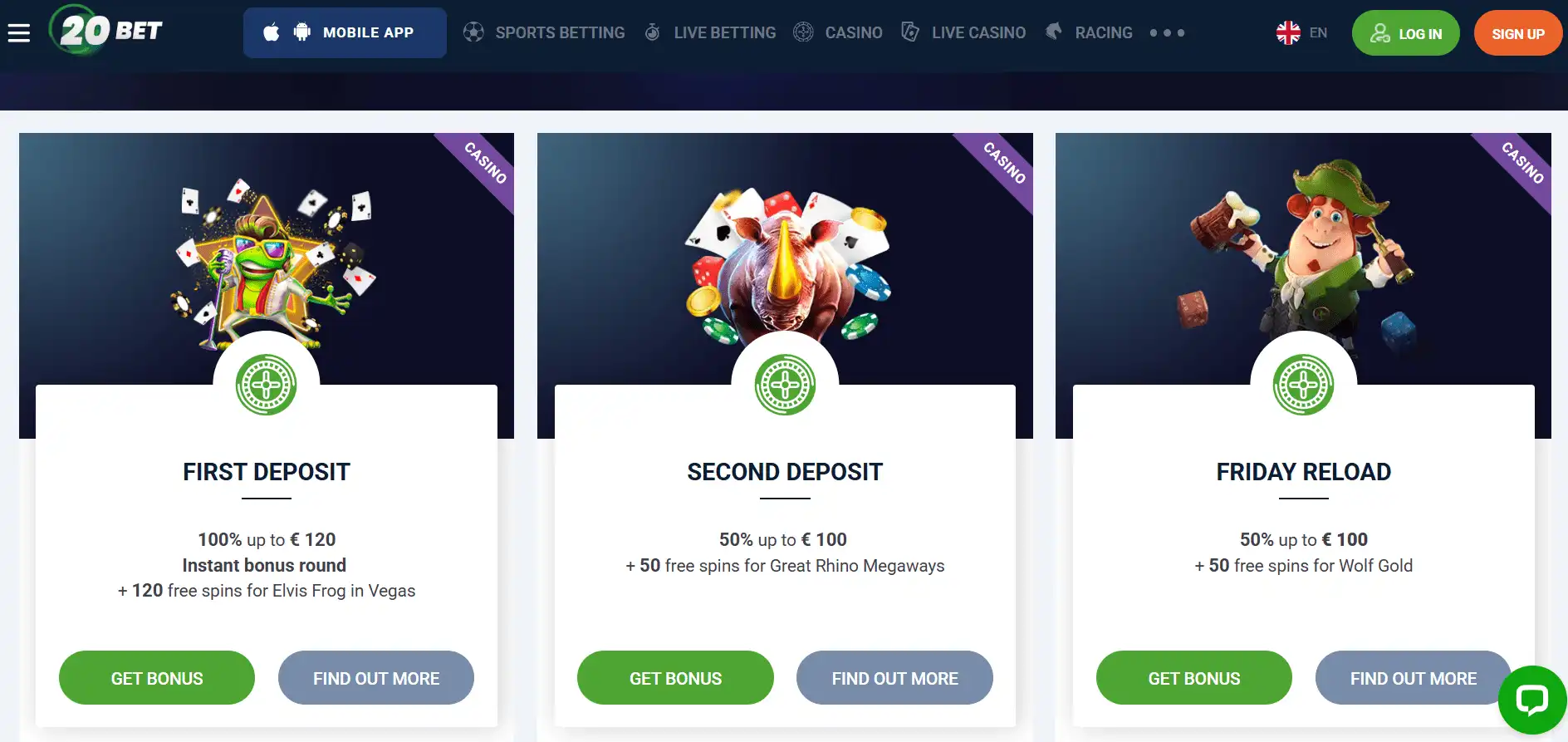 Novi igralci v igralnici 20Bet Casino lahko izbirajo med dvema bonusoma za dobrodošlico, odvisno od tega, ali imajo raje igralniške igre ali športne stave.