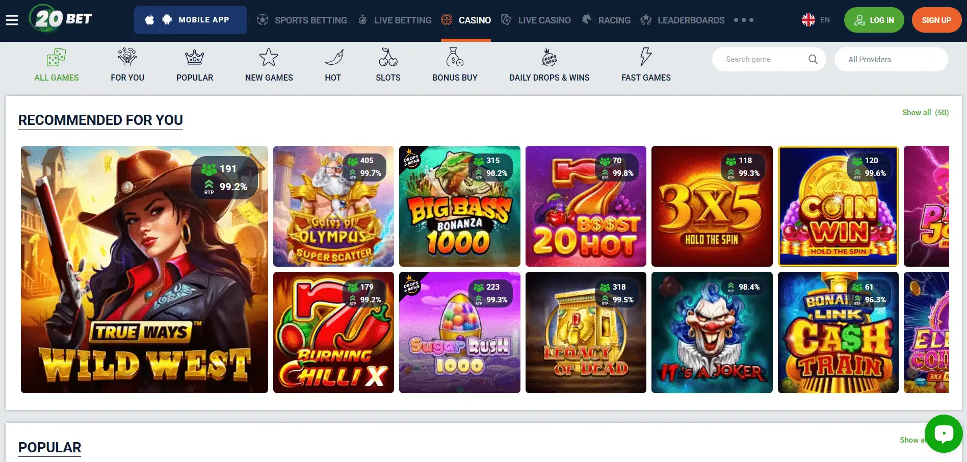 20Bet ponuja na tisoče igralnih avtomatov, od klasičnih sadnih avtomatov do najnovejših video igralnih avtomatov s filmskimi animacijami. Našli boste igre s funkcijami bonusnega nakupa, tematske igralne avtomate in mehaniko, ki je zasnovana tako, da poskrbi za veliko vznemirjenja. Številni naslovi so optimizirani za mobilno igranje v igralnici 20Bet Casino in so pripravljeni za igranje kadar koli in kjer koli.