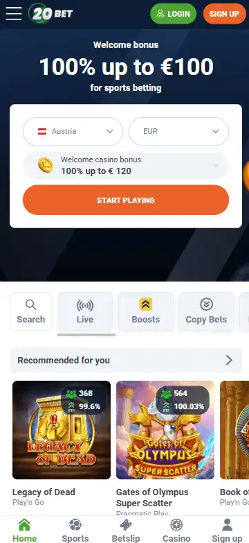 - Za prve športne stave lahko prejmete 100 % bonus 20Bet do 100 €
