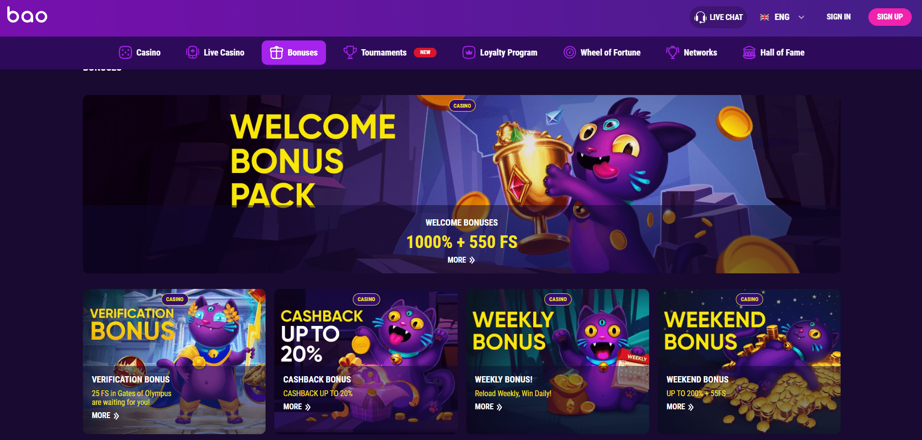 - Večstopenjski paket, ki ga Bao casino ponudba dobrodošlice promovira kot skupno 1000 % + 550 brezplačnih vrtljajev.
