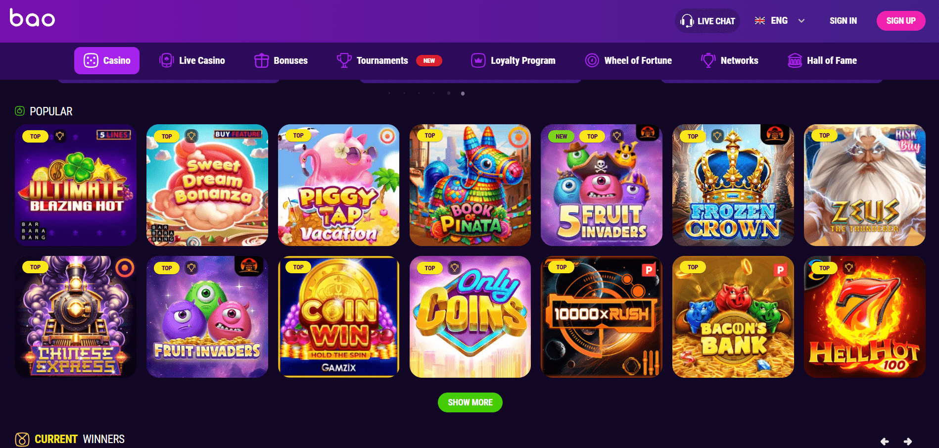 Prikaži večNaša ekipa NajboljseIgralnice je ugotovila, da ima Bao casino izbira iger širok nabor, primeren za Slovenijo. Med podrobnim Bao casino pregled smo videli, da katalog zajema klasične tri-kolutne igralne avtomate, sodobne video izdaje, Megaways, Hold & Win in številne jackpote. Ljubitelji namiznih iger lahko izbirajo med ruletom, blackjackom, baccarat in kazino pokrom z različnimi pravili. Delivci v živo ponujajo rulet, blackjack, baccarat in igre v slogu TV-šovov v realnem času za večjo vključenost. Možnosti takojšnjega dobitka in praskanke omogočajo hitre seje. Uporabni filtri zožajo izbiro glede na tip in funkcije, medtem ko mobilna igra za uporabnike v Sloveniji ostaja gladka. Jasni stavni razponi in urejena postavitev omogočajo preprosto izbiro iger v Republiki Sloveniji.