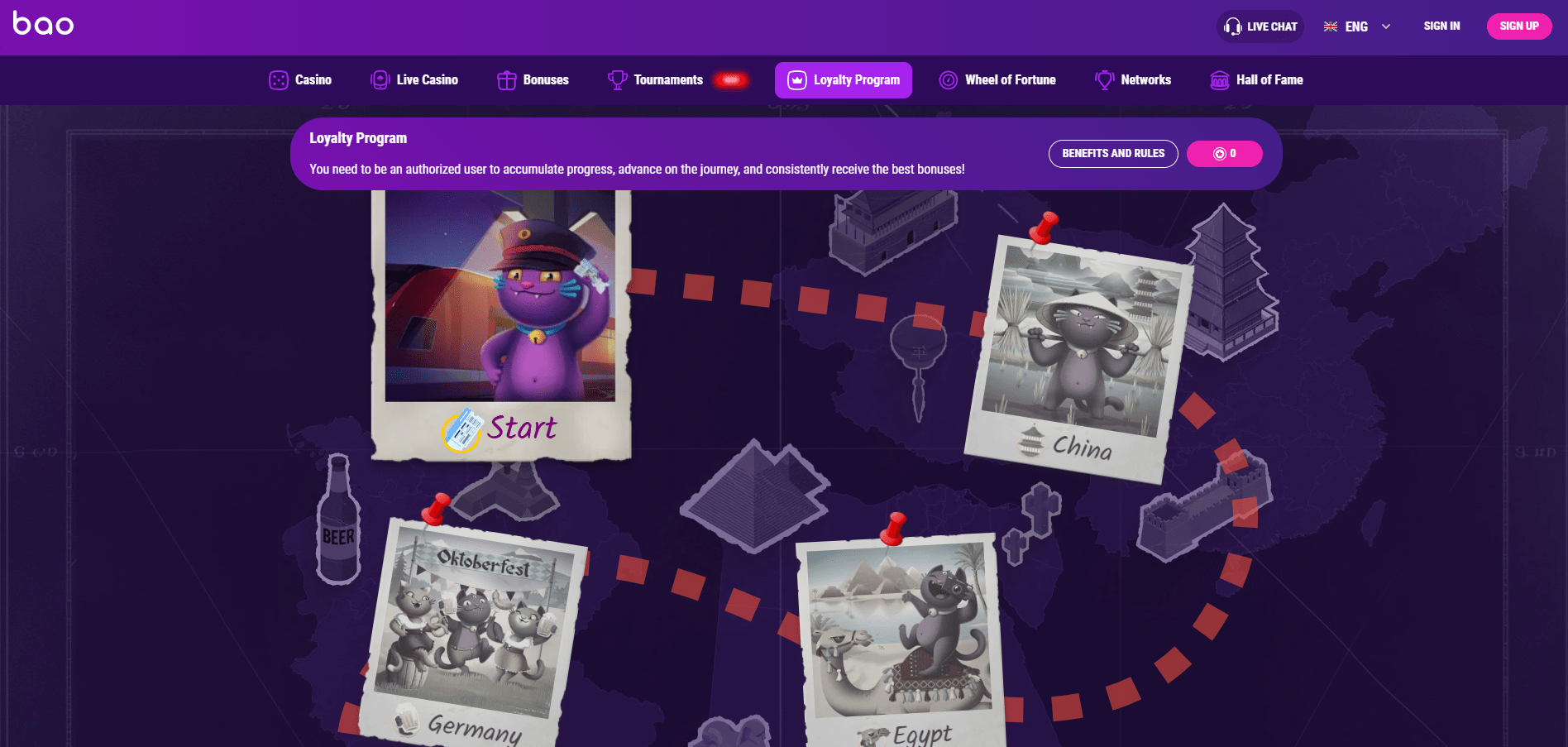 Bao ima stopnjevan program, poimenovan po destinacijah, ki se začne pri Start in se vzpenja skozi Kitajsko, Egipt, Nemčijo, Italijo, Francijo, Anglijo, Maldive, Rio, New York in Las Vegas. Napredek temelji na točkah zvestobe. Ugodnosti rastejo z vsako stopnjo: