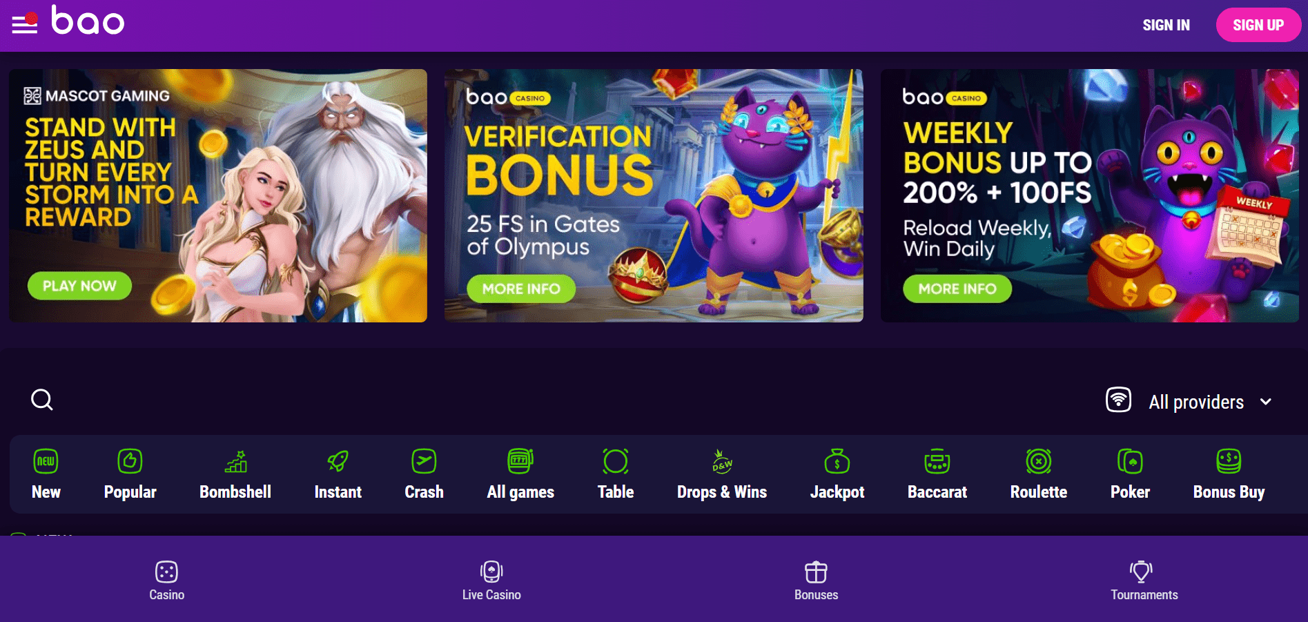 Naša Bao casino recenzija na NajboljseIgralnice razkriva, da Bao gosti raznoliko ponudbo ponudnikov iger. Med najbolj znanimi imeni so NetEnt, Play’n GO, Yggdrasil in Games Global (Quickfire), poleg tega pa še Betsoft, BGaming, Amatic, EGT, Elk Studios in Quickspin. Ta mešanica zajema klasične igralne avtomate, inovativne mehanike in različne RTP profile, kar slovenskim igralcem ponuja širok izbor tako na namiznih kot mobilnih platformah. Dostopnost se lahko razlikuje glede na regijo in valuto, zato filter po ponudniku v preddverju pomaga SLO uporabnikom hitro najti želene kataloge.