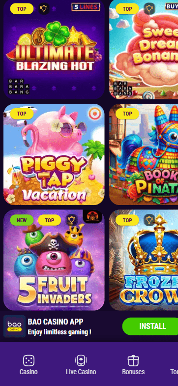 Nismo našli potrjene, uradne aplikacije v trgovinah za iOS ali Android. Po Bao casino izkušnje lahko igrate prek optimizirane mobilne spletne strani ali, če je ponujeno, iz brskalnika dodate bližnjico/PWA.