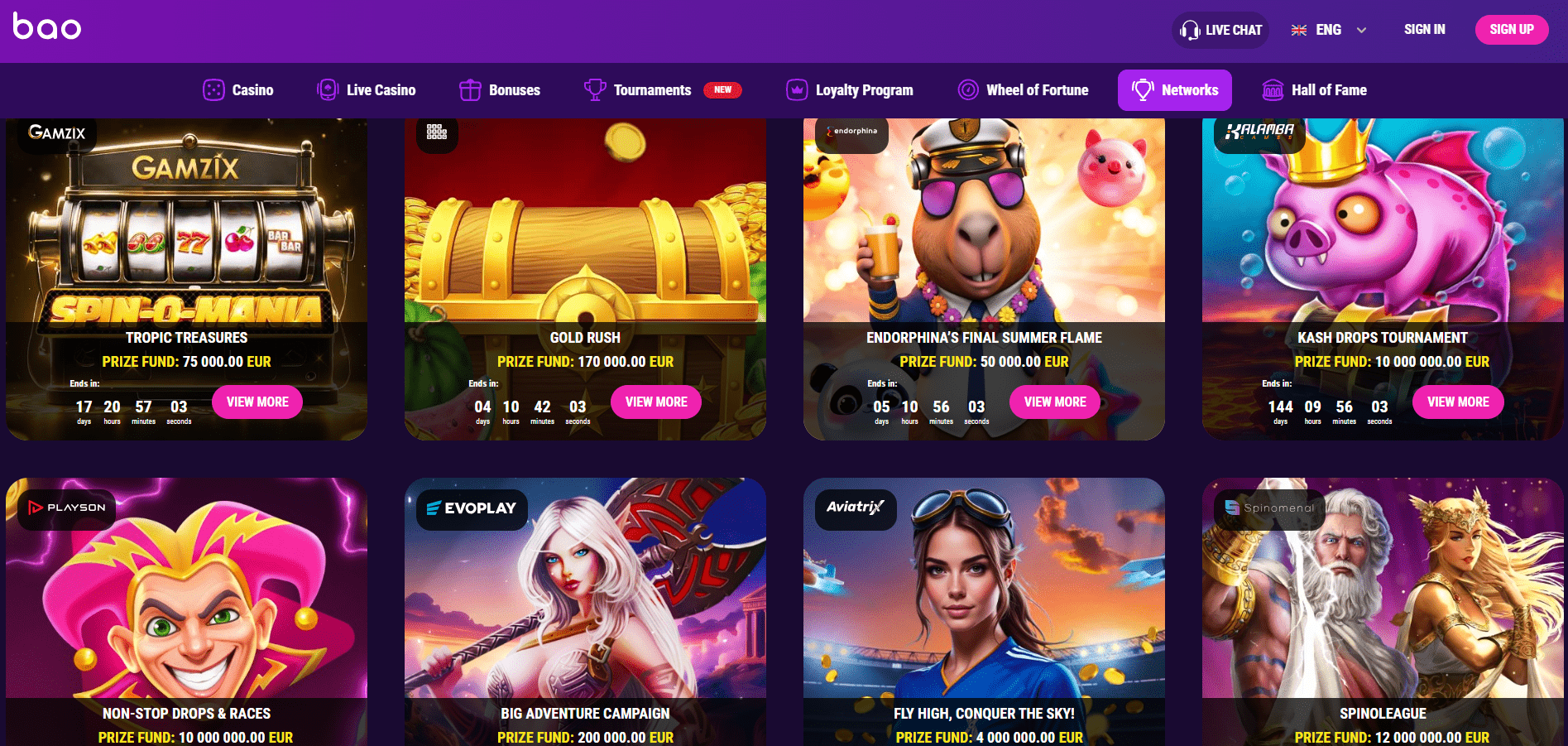 Sezonski dogodki in tekoče lestvice, povezane z Bao casino bonus, se pojavljajo v promocijskem delu. Pogoji za vstop, nagradni skladi, kvalificirane igre in pravila točkovanja so prikazani na strani turnirjev v vašem računu. Bao casino promocijska koda za te dogodke običajno ni potrebna, saj se večina promocij aktivira samodejno ob izpolnitvi pogojev. Priporočamo, da slovenski igralci pred igranjem preverijo urnik, saj se datumi, strukture nagrad in upravičeni naslovi pogosto spreminjajo.