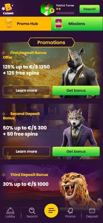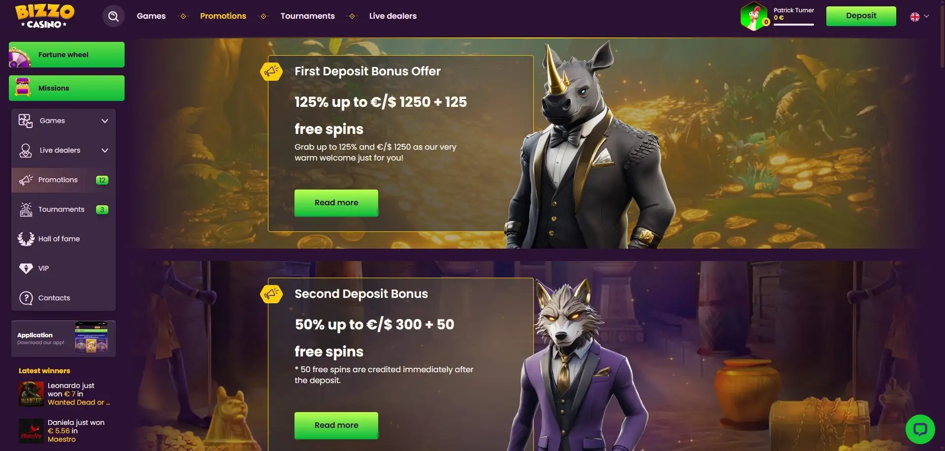 Nove slovenske igralce v igralnici Bizzo pričaka bogat bonus na prvi depozit. Standardna ponudba vključuje 100 % ujemanje do 100 € in 100 brezplačnih vrtljajev, ki mu sledi bonus na drugi depozit do 200 € in 50 brezplačnih vrtljajev. Za najnovejše podrobnosti o bonusih in kode preverite stran s promocijami neposredno na spletnem mestu.