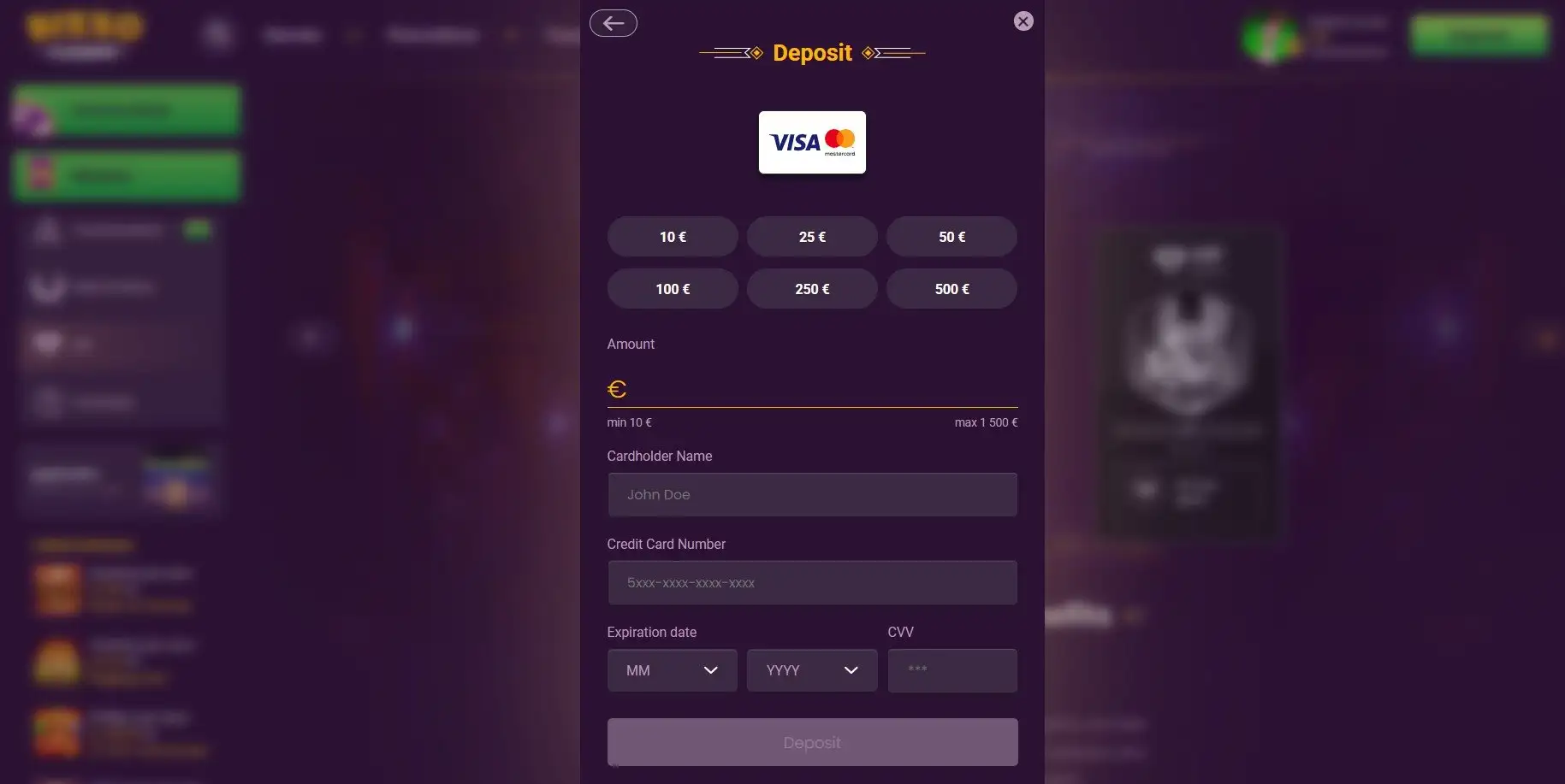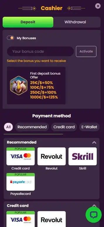 - Izberite način plačila. Izbirajte med široko paleto razpoložljivih možnosti, kot so VISA, Mastercard, Skrill, Neteller, Paysafecard ali kripto možnosti, kot sta Bitcoin ali Ethereum.
