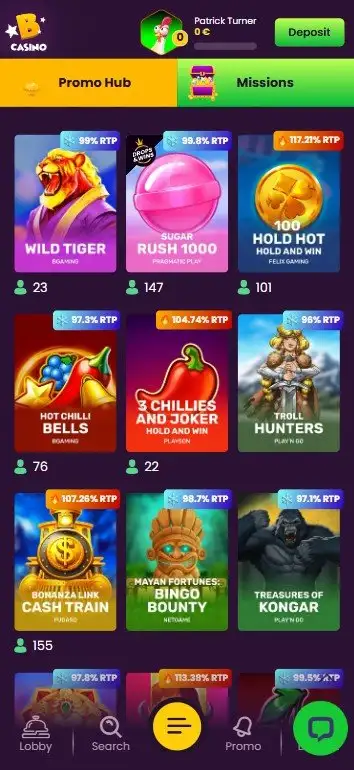 - Začni igrati. Vaše stanje bo takoj napolnjeno in pripravljeni boste raziskati obsežno zbirko iger igralnice Bizzo.