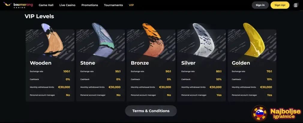 Program zvestobe v Boomerang Casino vključuje pet VIP stopenj, pri čemer vsaka ponuja vse boljše ugodnosti, kot so višje omejitve za dvige, osebni upravitelji računa in višji odstotki povračila denarja. Boomerang Casino igralnica Slovenija vse nove uporabnike samodejno uvrsti na osnovno raven, nato pa se lahko s rednim igranjem in zbiranjem kovancev zvestobe pomikajo višje. Kovanci se pridobivajo s stavami na upravičenih igrah in jih je mogoče pozneje zamenjati za nagrade. Sistem zvestobe vpliva tudi na dnevne in mesečne omejitve dvigov ter višjim stopnjam omogoča večjo prilagodljivost.