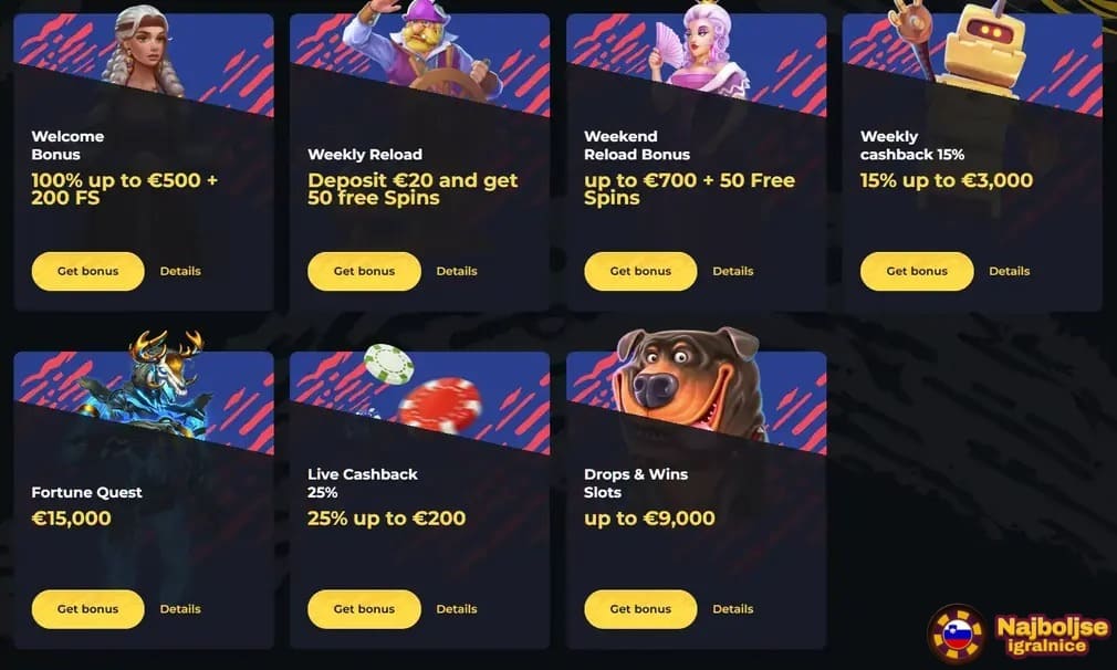 - Tedenski Bonus za Ponovno Polnjenje – Na voljo od ponedeljka do četrtka; igralci lahko zahtevajo 50 brezplačnih vrtljajev z depozitom v višini 20 € ali več.