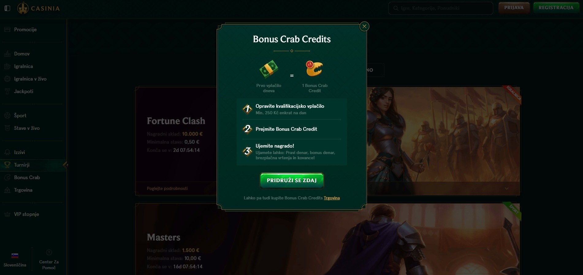 Novi uporabniki lahko zahtevajo 100 % bonus dobrodošlice do 500 €, plus 200 brezplačnih vrtljajev in 1 krog igre Bonus Crab. Uporabniki kriptovalut lahko izberejo tudi 200 % Crypto bonus dobrodošlice do 3.000 USDT ali 100 % do 200 USDT. Ti bonusi zahtevajo minimalni polog 20 € (ali enakovredno v kriptovalutah) in imajo 35-kratno zahtevo po stavljenju bonusnih sredstev. Brezplačni vrtljaji so na voljo za izbrane igre in se sproščajo v serijah. Vse to spada pod Casinia casino ponudba dobrodošlice, ki je prilagojena tako klasičnim igralcem kot tudi tistim, ki uporabljajo kripto.