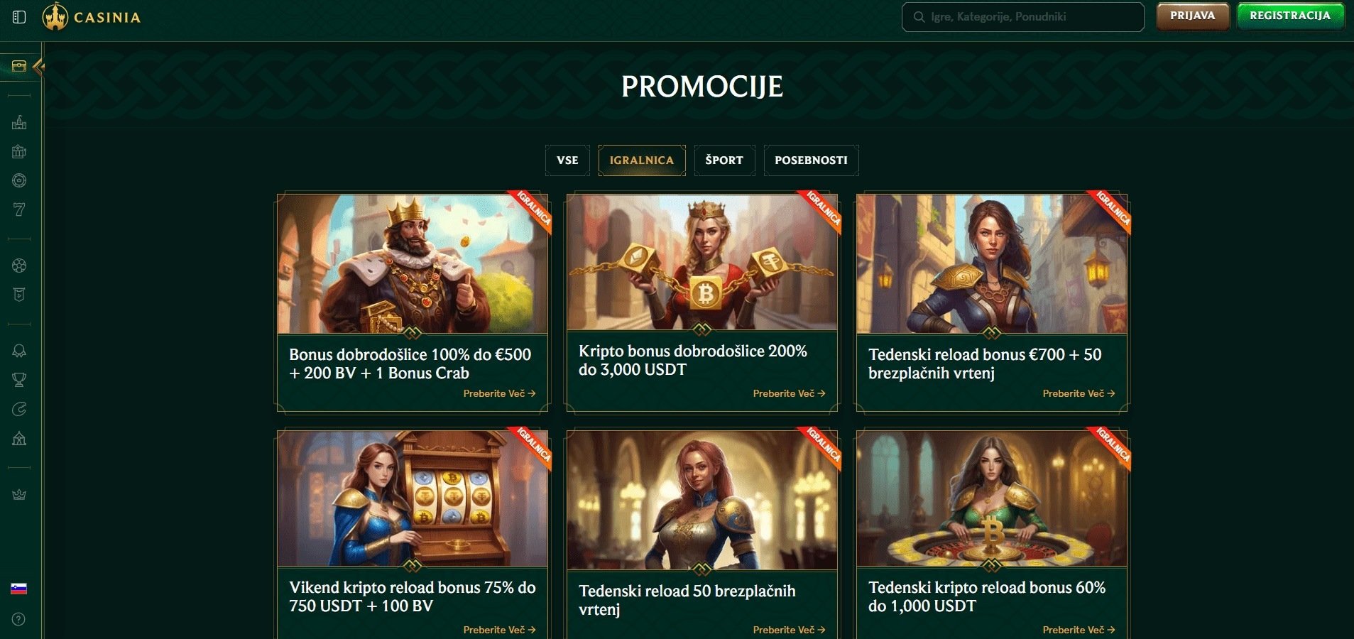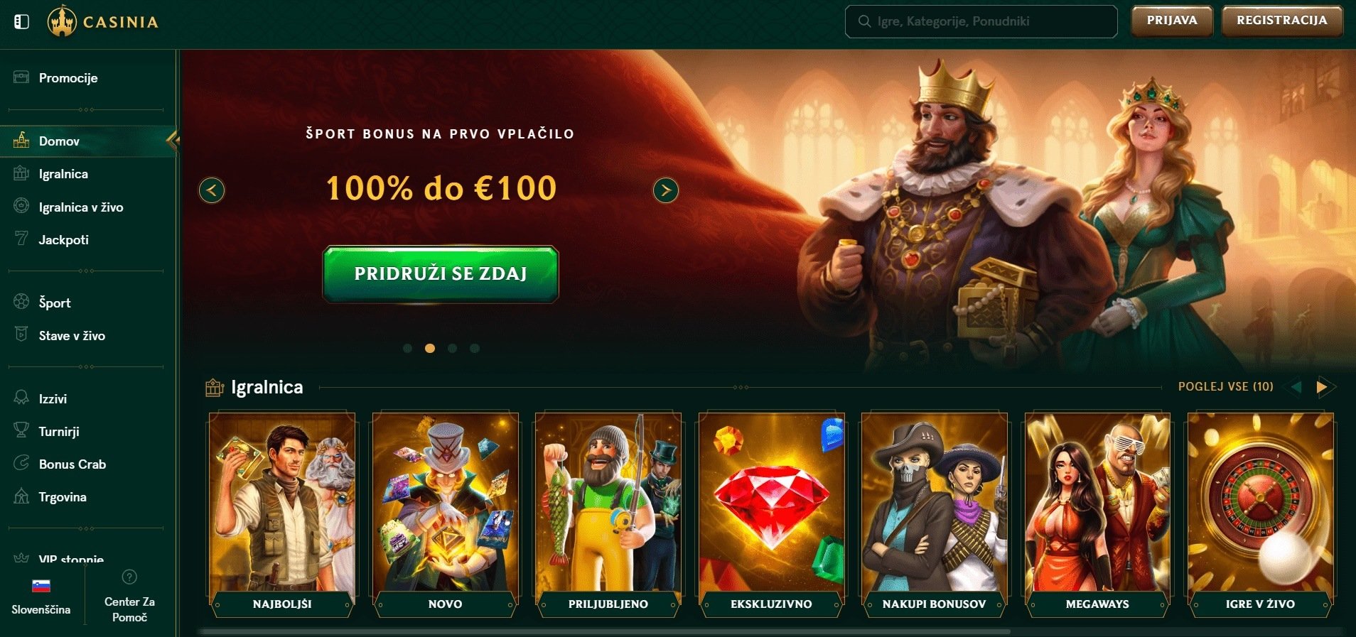 Casinia casino pregled razkriva, da je Casinia Casino spletna platforma, ki slovenskim igralcem prinaša kombinacijo stila, raznolikosti in udobja. Upravljana je s strani Rabidi N.V. in ima licenco Curaçao, kar zagotavlja varen in reguliran prostor za spletno igranje. Naša ekipa na NajboljseIgralnice je podrobneje preučila delovanje strani z vidika lokalnih igralcev. Od širokega izbora igralnih avtomatov do možnosti z delivci v živo in rednih turnirjev, Casinia ponuja solidno zabavo. Na voljo so priljubljene plačilne metode v Republiki Sloveniji, vključno s Skrillom in bančnimi nakazili. Stran je v celoti prevedena v slovenščino in podpira EUR, kar celotno izkušnjo naredi bolj lokalno. Kot del naše Casinia casino ocena igralnice smo ocenili njihove bonuse, uporabnost in podporo, ter tukaj je, kar smo ugotovili.