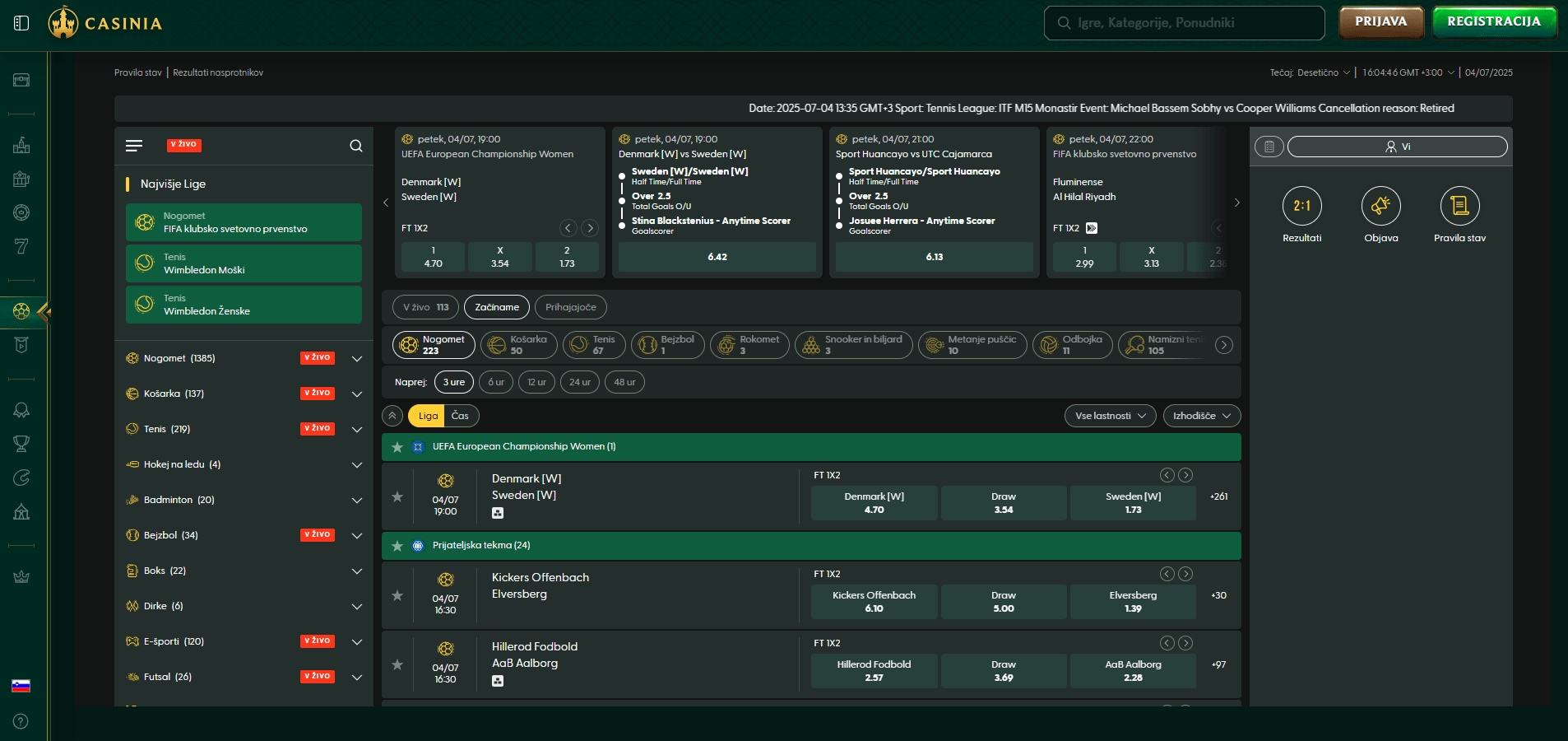 Da, Casinia Sports ponuja sekcijo za stave v živo z aktualnimi kvotami za nogomet, košarko, tenis in še več. Ta je popolnoma integrirana v glavno platformo.