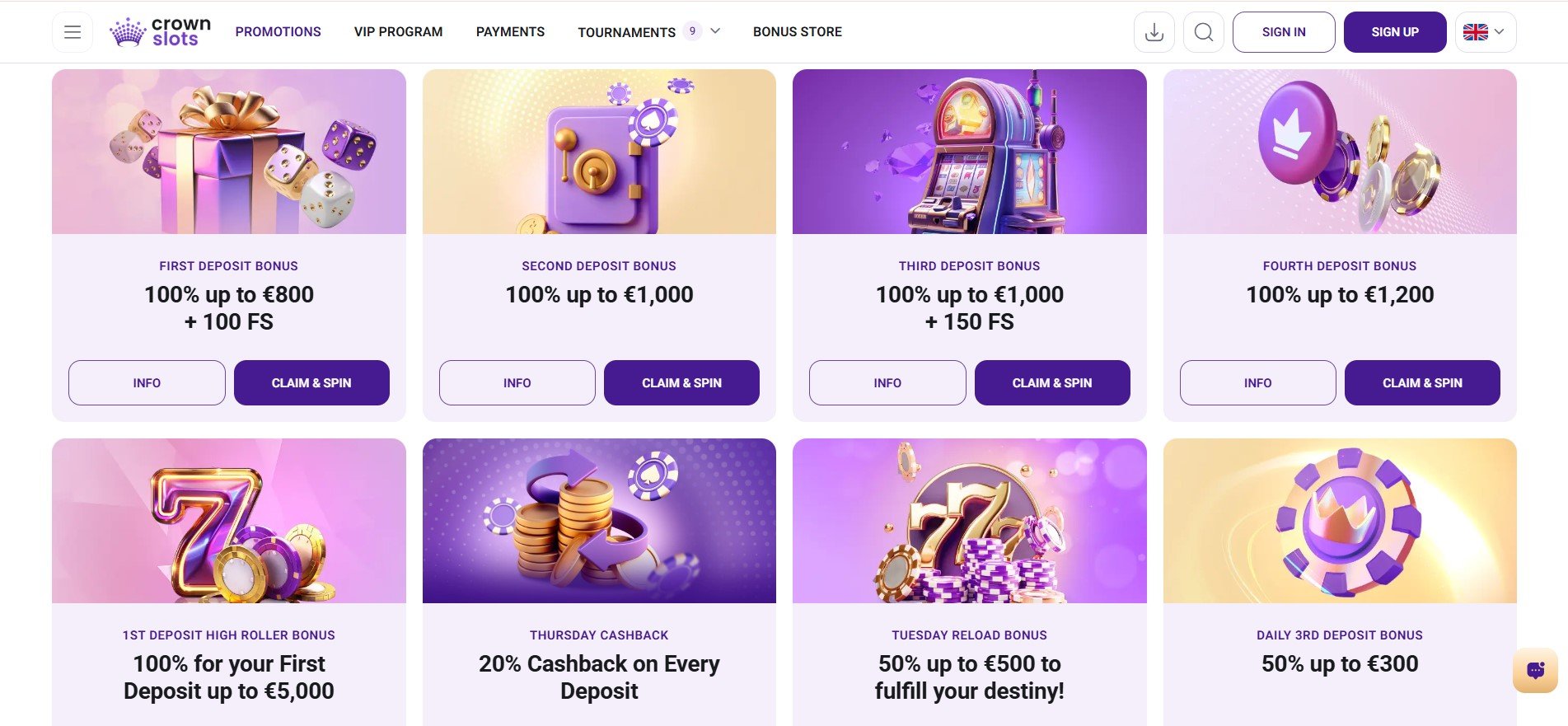 Casino bonus program predstavlja enega izmed najbolj obsežnih bonusnih paketov na trgu. Casino ponuja več nivojev spodbud tako za nove kot obstoječe igralce. Čeprav platforma ne ponuja CrownSlots casino bonus brez pologa za nove igralce, je paket dobrodošlice vseeno zelo privlačen. CrownSlots casino bonus v igralnici vključuje štiri različne stopnje nagrad na prvih štirih pologih, skupaj z možnostjo high roller bonusa. Promocije se nadaljujejo tudi po začetnem paketu dobrodošlice. Ponudba dobrodošlice omogoča igralcem, da maksimizirajo svojo začetno igralniško vrednost. Program zvestobe dodatno nagrajuje redne igralce z naraščajočimi benefiti. Promocijska koda je potrebna za aktivacijo večine bonusov. CrownSlots casino bonusi za igralce zahtevajo minimalno 20 EUR polog za aktivacijo.