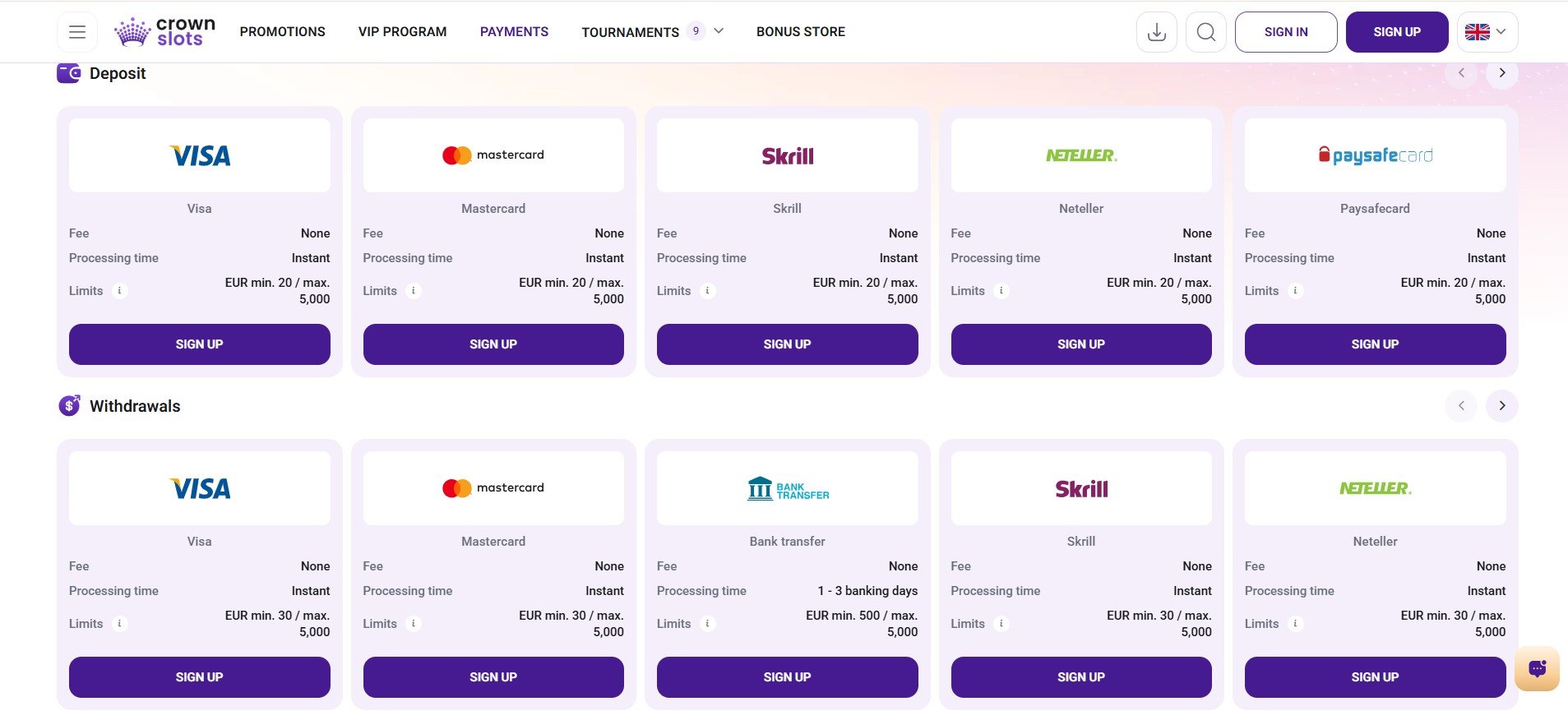 CrownSlots casino plačilne metode pokrivajo širok spekter tradicionalnih in sodobnih opcij. Sprejemajo Visa in Mastercard kreditne ter debetne kartice, e-denarnice Skrill in Neteller, ter več kriptovalut vključno z BTC, ETH, LTC, USDT, DOGE in XRP. Minimalni polog znaša 20 EUR (ali ekvivalent v drugi valuti), medtem ko maksimalni zneski pologov variirajo glede na izbrano metodo. Vsi pologi se obdelajo takoj, kar omogoča takojšen začetek igranja. Plačila so brezplačna za vse podprte metode. Pomembno je opozoriti, da casino ni finančna institucija in ne ponuja menjalniških storitev med valutami. Igralci iz Slovenije lahko uporabljajo standardne EUR transakcije za najlažje upravljanje sredstev.