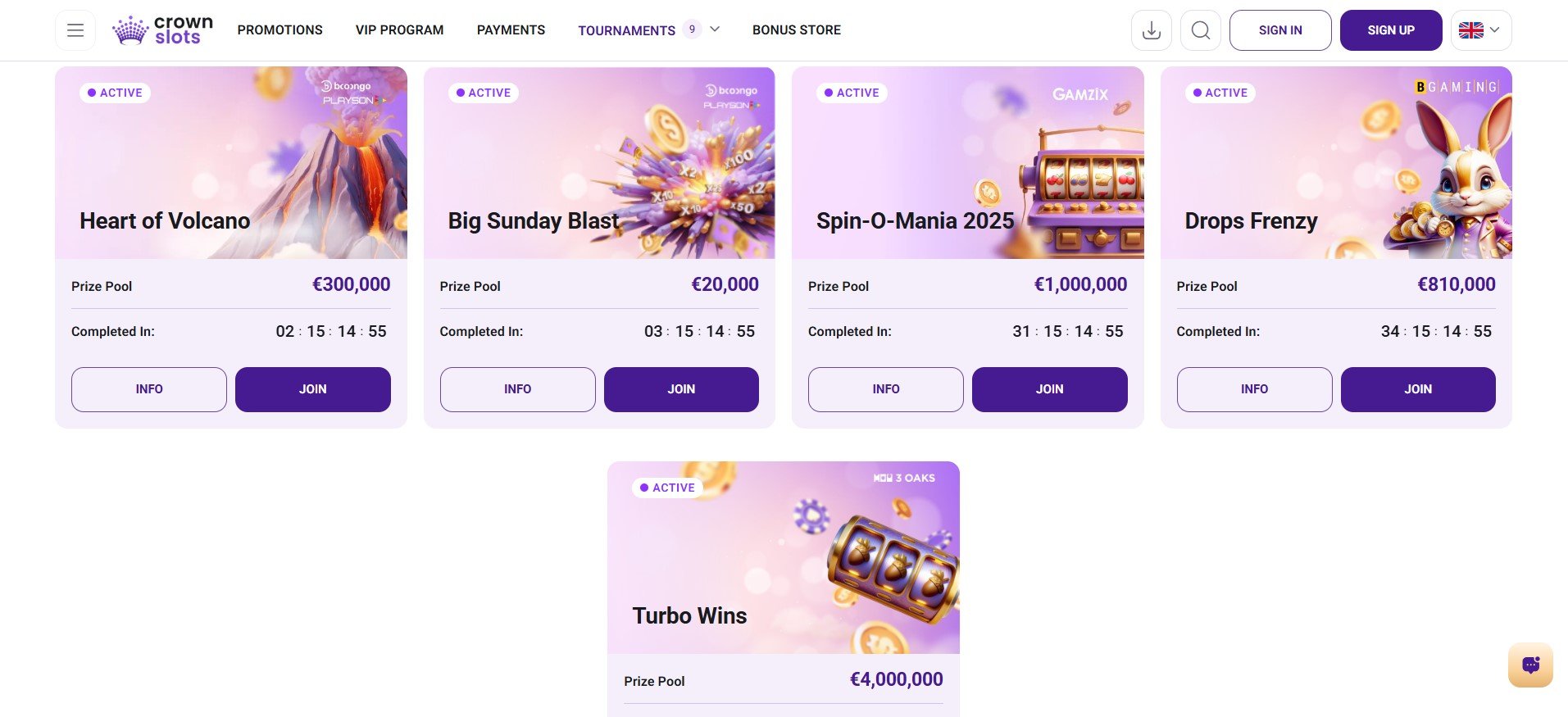 Casino redno organizira turnirje z velikimi nagradnimi skladi. Trenutno aktivni turnirji vključujejo Heart of Volcano (300.000 EUR), Big Sunday Blast (20.000 EUR), Spin-O-Mania 2025 (1.000.000 EUR), Drops Frenzy (810.000 EUR) in Turbo Wins (4.000.000 EUR). Bonus Store omogoča nakup dodatnih brezplačnih vrtljajev, lootboxov, srečk in vrtenja na kolesu sreče z zbranimi točkami ali denarjem.