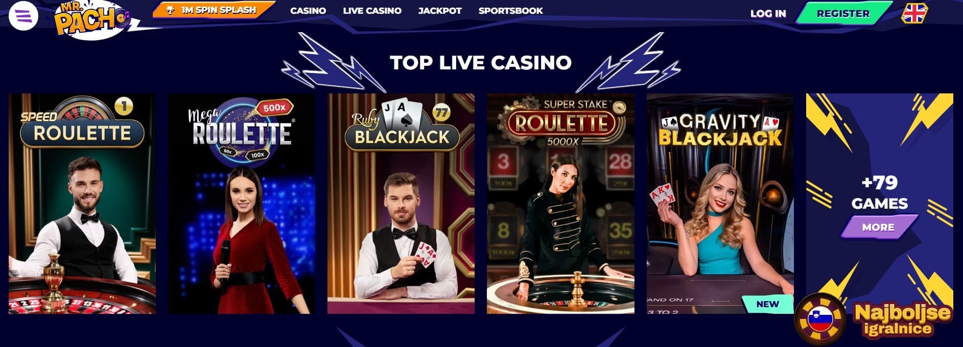Igralni avtomati prevladujejo v izboru iger in vključujejo tako klasične sadne igre kot sodobne video slote z bonus krogi. Igralci bodo našli znane naslove, kot sta Gates of Olympus in Big Bass Bonanza. Med namiznimi igrami so na voljo različice blackjacka, rulete in baccarata. Del igralnice v živo, ki ga poganjajo vrhunski studii, ponuja realistično igranje v realnem času s profesionalnimi delivci. Naša Mr Pacho casino recenze je potrdila, da knjižnica igralnice pokriva vse ključne elemente in še več – tako za začetnike kot za izkušene igralce iz Republike Slovenije.