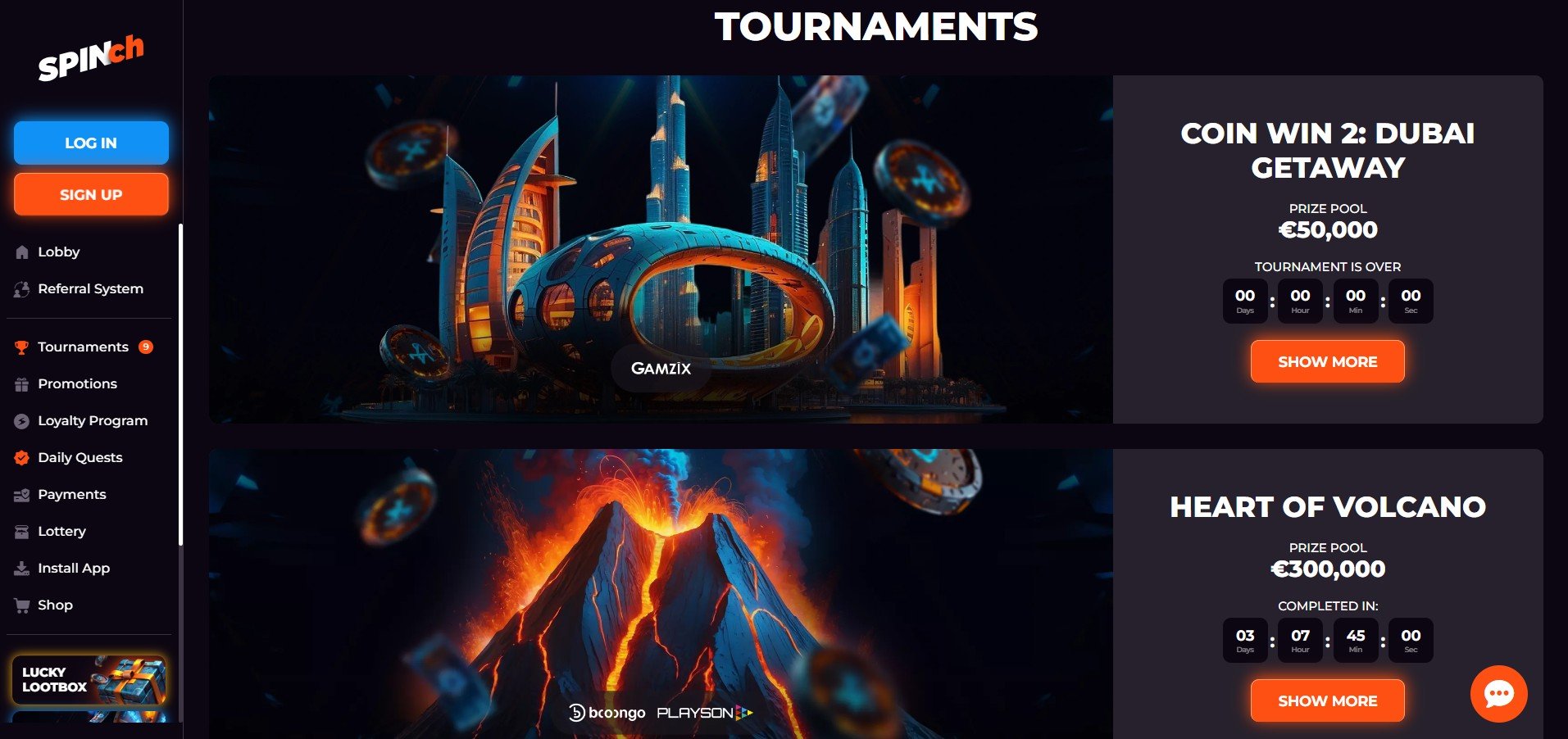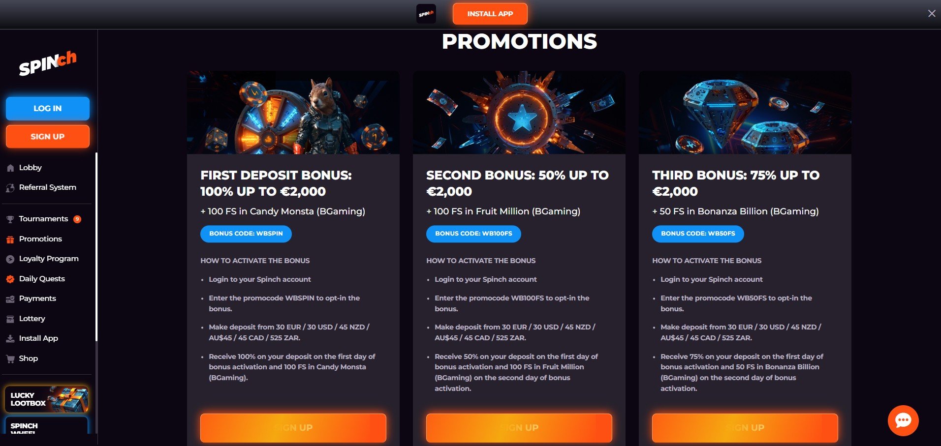 Spinch casino bonus sistem je obsežen in ponuja različne možnosti za nove in obstoječe igralce. Bonus paketi so prilagojeni različnim tipom uporabnikov, od običajnih do visokih vlagateljev. Spinch casino bonus v igralnici vključuje dobrodošlice, tedenski cashback, reload bonuse in ekskluzivne VIP nagrade.