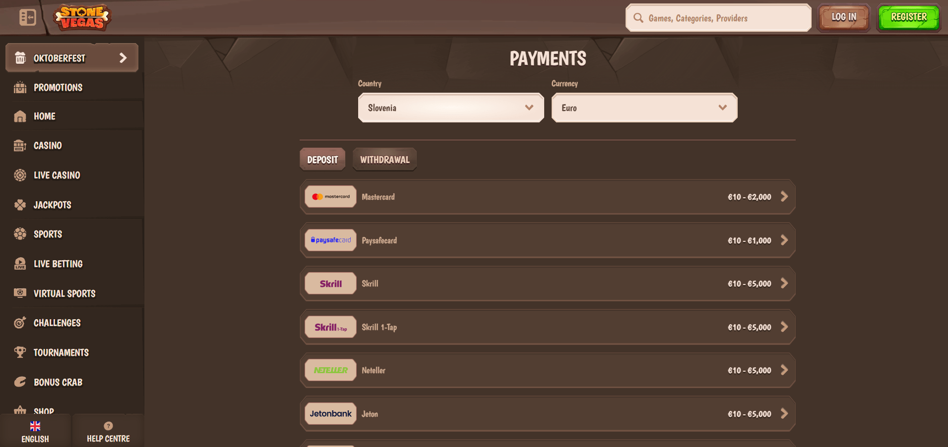 StoneVegas Casino podpira širok nabor rešitev za plačevanje, ki so priročne za slovenske igralce. StoneVegas casino plačilne metode vključujejo možnosti za polog z Mastercard, Paysafecard, Skrill, Skrill 1-Tap, Neteller, Jeton, MiFinity in USD Tether, pri čemer omejitve običajno začnejo pri 10 €. Izplačila so na voljo prek Visa, Mastercard, bančnega nakazila, Revolut, Skrill, Neteller in Jeton, z največjimi omejitvami do 5.000 €. Te možnosti zagotavljajo tako prilagodljivost kot varnost, kar omogoča nemotene transakcije za uporabnike v Republiki Sloveniji.
