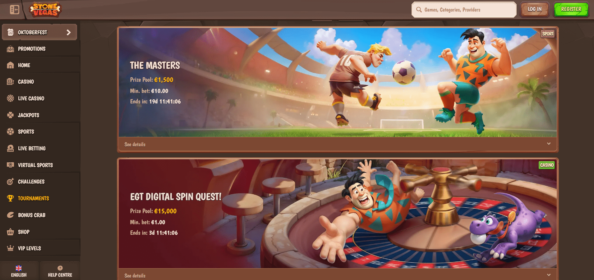 Turnirji so ena izmed izstopajočih funkcij pri StoneVegas. Bonus StoneVegas casino je pogosto del teh kampanj, kot je tekmovanje z nagradnim skladom 6.000.000 € ali sezonski dogodki, kot je Oktoberfest, ki dodajo privlačen tekmovalni pridih. Igralci napredujejo po lestvicah z igranjem kvalificiranih iger, pri čemer glavne nagrade vključujejo denarne nagrade, brezplačne vrtljaje in ekskluzivne bonuse.