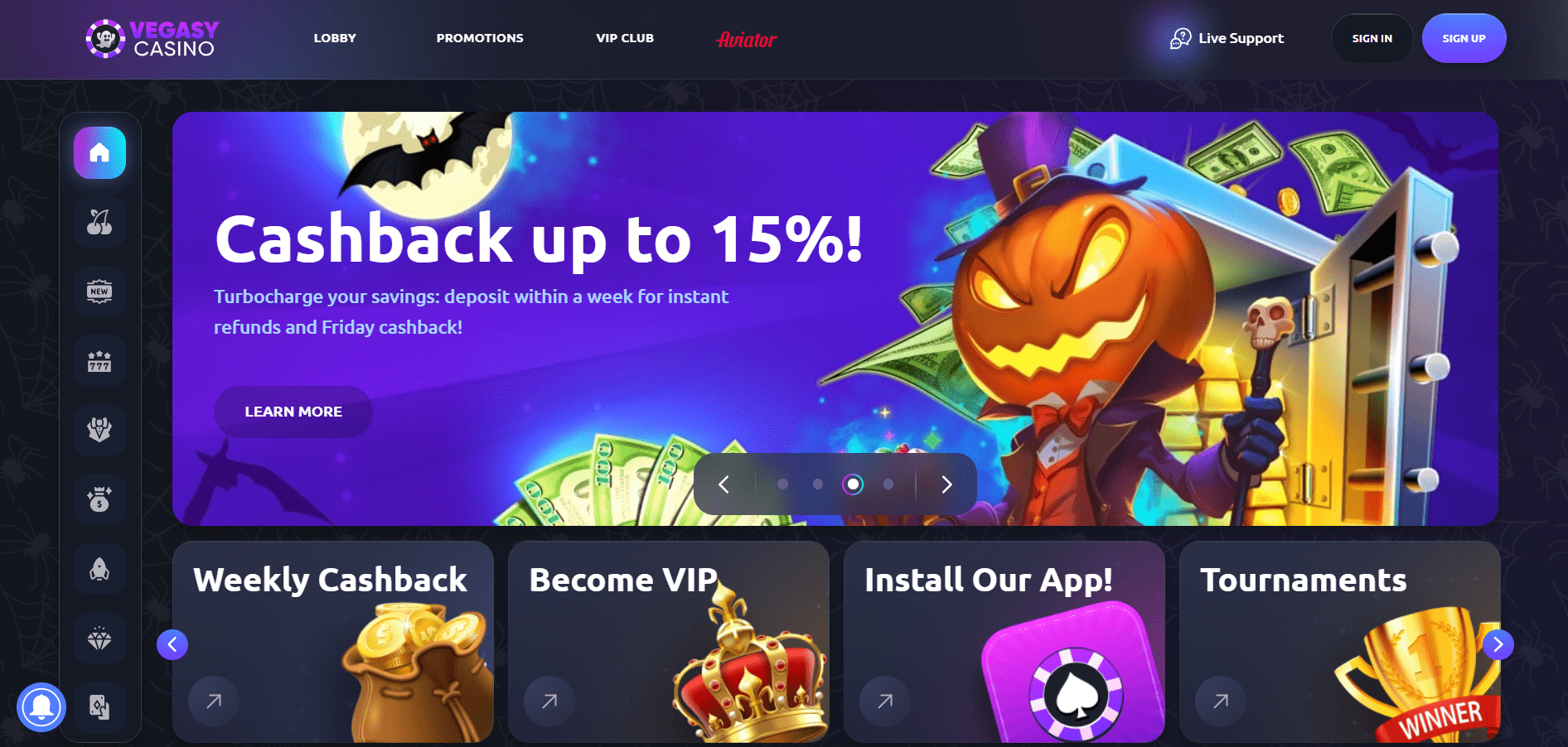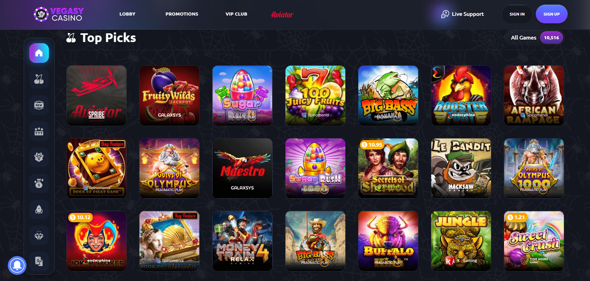 Višje stopnje v programu zvestobe omogočajo večje omejitve izplačil, ki lahko dosežejo do 100.000 $ na mesec za člane na vrhu. Kot poudarja naša VegasLegacy casino pregled, nekatera priljubljena področja, kot so igre z delivci v živo, ruleta in določeni ponudniki (npr. Gaming Corps, Spribe), ne prispevajo k pridobivanju točk zvestobe.
