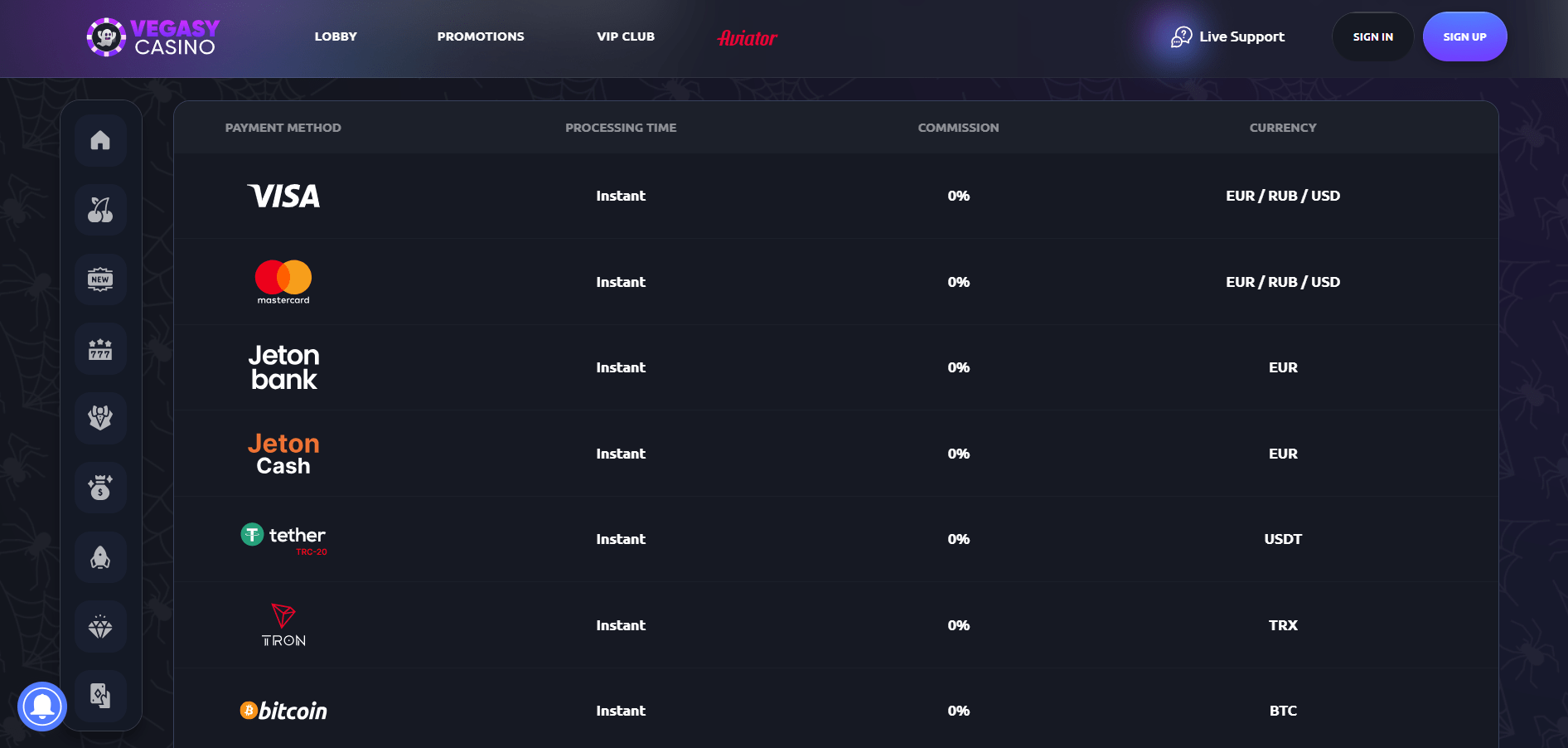 VegasLegacy Casino podpira širok nabor metod za pologe in izplačila. Igralci iz Slovenije lahko uporabljajo Visa, MasterCard, Jeton, Jeton Cash ter številne kriptovalute, kot so Bitcoin, Ethereum, Litecoin, Tether, Binance Coin in druge. Vse transakcije so obdelane takoj, brez dodatnih stroškov s strani igralnice, pri čemer so sprejete različne fiat valute (EUR, USD) in priljubljeni digitalni kovanci. S hitrim procesiranjem in varnimi sistemi je razdelek za VegasLegacy casino plačilne metode zasnovan tako, da slovenskim uporabnikom omogoča učinkovite pologe in izplačila.
