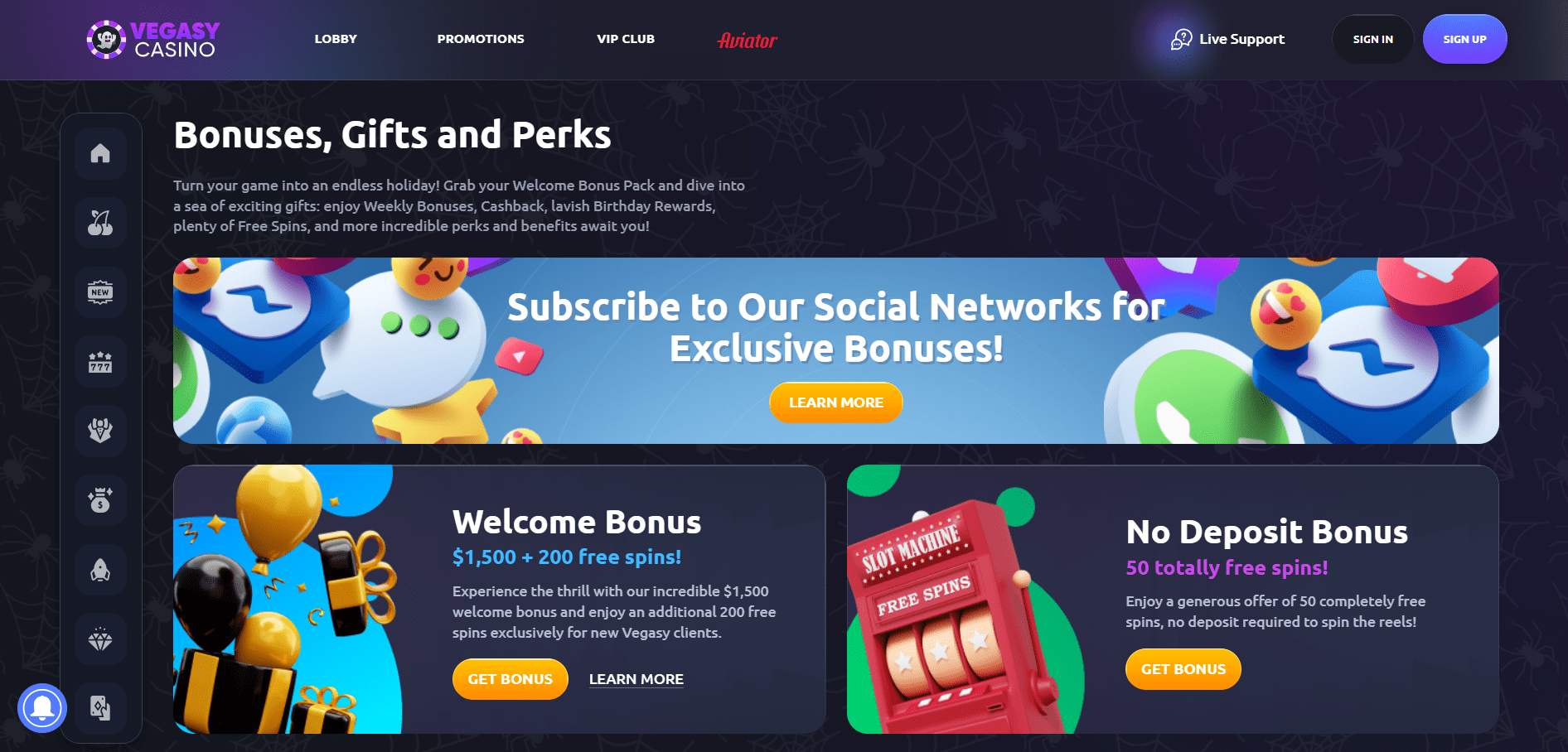 - Bonus za naročnino – nagrade za pridružitev VegasLegacy družbenim kanalom, kot so Telegram, Instagram, WhatsApp in YouTube.