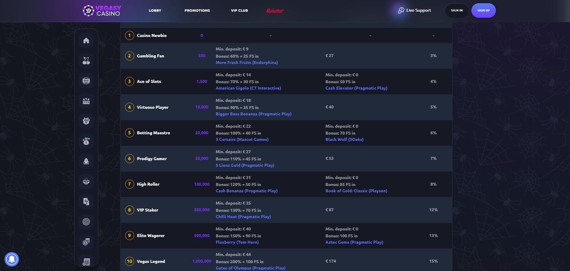 - Vegas Legend (1.000.000 točk) – 200 % bonus + 100 vrtljajev, rojstnodnevni bonus 175 €, 15 % cashback.