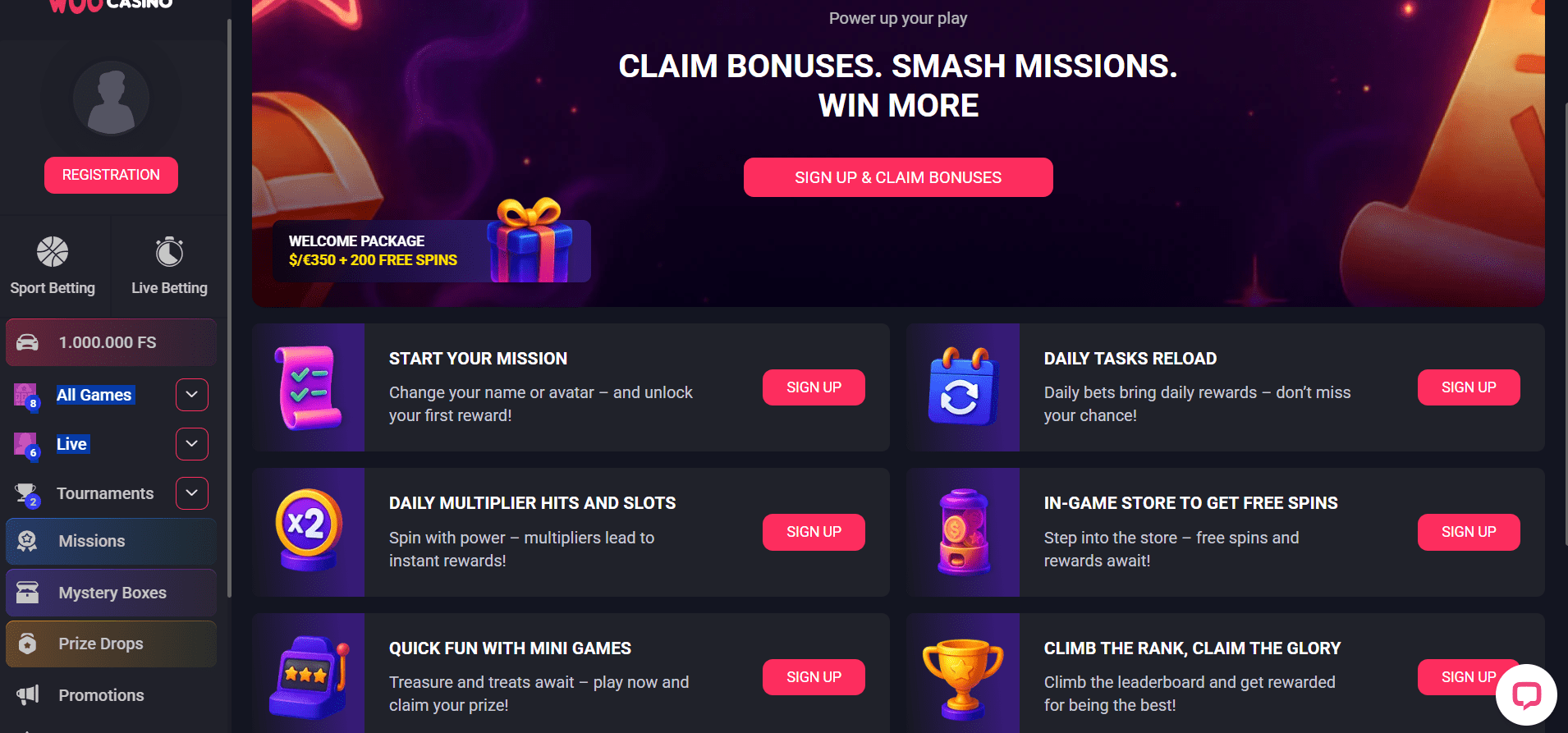 Program zvestobe, znan kot Woo Missions, temelji na sistemu stopenj. Igralci napredujejo po lestvici z izpolnjevanjem misij in rednim igranjem. Z vsako novo stopnjo se odklenejo boljše Woo casino nagrade igralnice, vključno z brezplačnimi vrtljaji, bonus gotovino in na zadnji stopnji celo možnostjo za osvojitev Porscheja 911. Vsaka misija doda XP vašemu računu, igralci iz Republike Slovenije pa lahko v programu popolnoma sodelujejo.