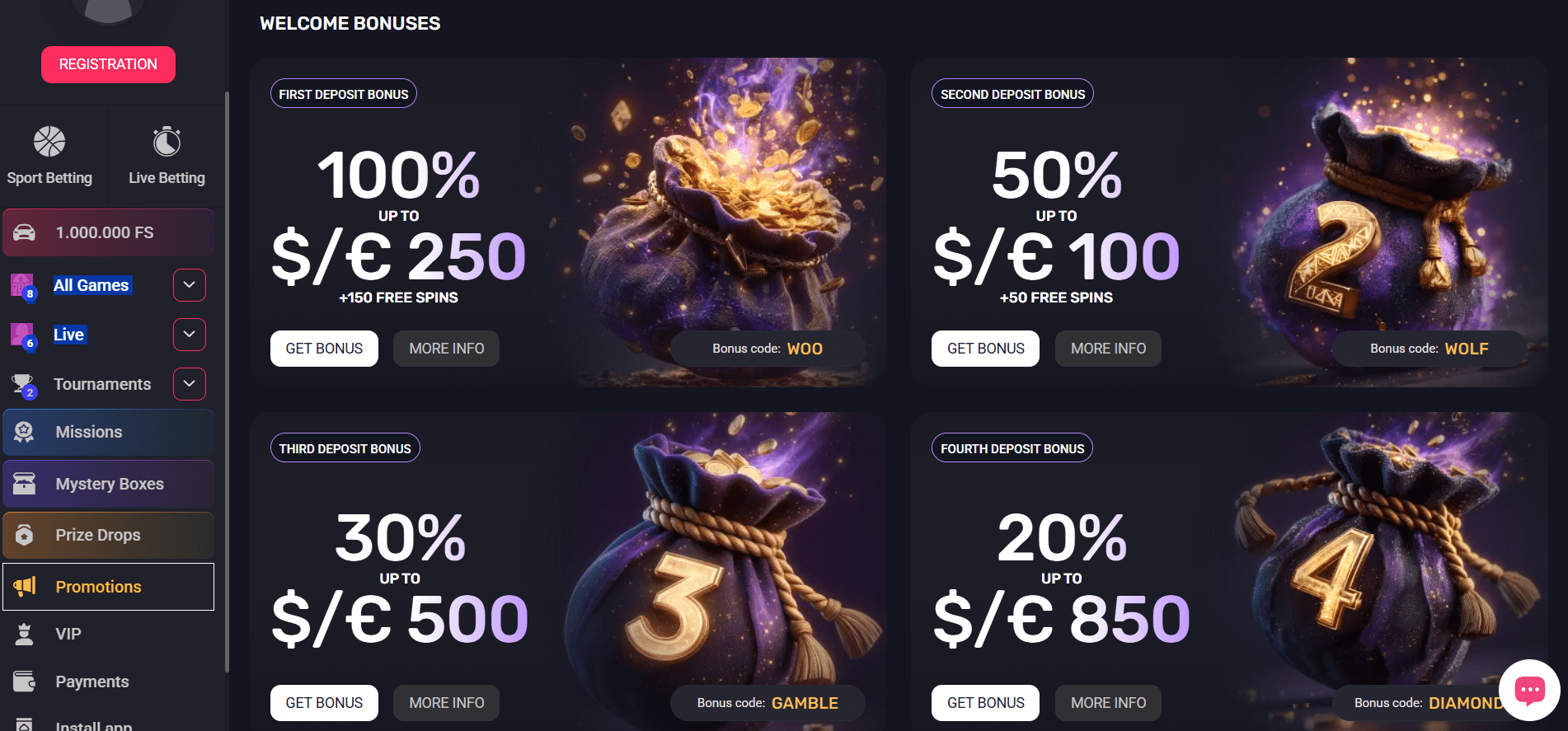 Woo Casino ponuja obsežno izbiro bonusov, prilagojenih tako novim kot rednim igralcem. Od večstopenjskega paketa dobrodošlice do tedenskih ponovno naloženih bonusov in skrivnostnih škatel, je vedno na voljo nekaj, kar izboljša vašo igralno izkušnjo. Slovenski igralci lahko v celoti izkoristijo te promocije z uporabo valute EUR ter uživajo v stalnih spodbudah prek depozitov, misij in turnirjev. Bonus Woo casino je zasnovan tako, da ustreza različnim slogom igranja in nagrajuje zvestobo.