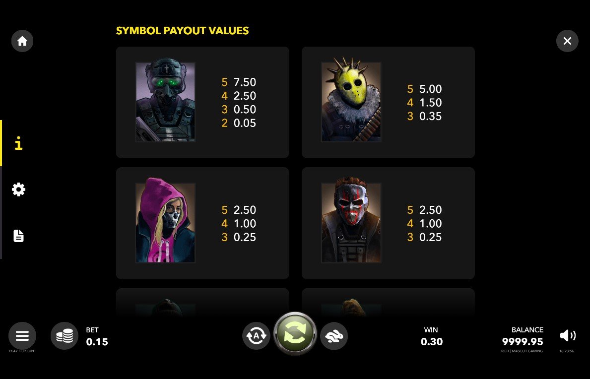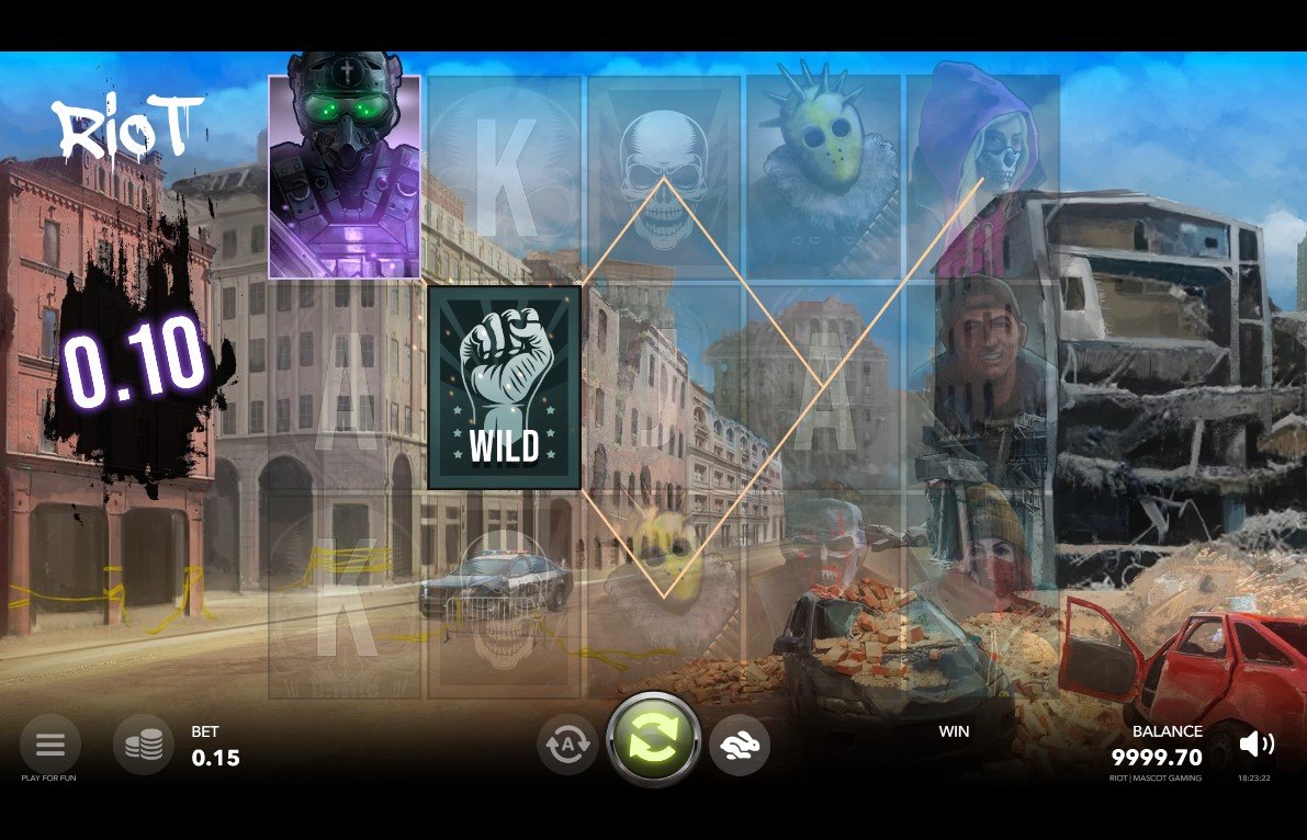 Pred vsakim krogom sem izbral ustrezno vrednost stave prek preglednega drsnika, kar mi je dalo jasen nadzor nad proračunom, kot pri najboljših igre za pravi denar. Zadetki nastanejo, ko se simboli ujemajo na aktivnih linijah, medtem ko spin sprožim brez zamika. Ko sem želel igrati bolj sproščeno, sem pogosto preklopil na igraj The Riot, ker mi je nižji vložek omogočil daljšo sejo brez prevelikega tveganja.